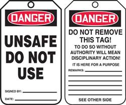 Our 25 pack of "Danger Unsafe" tags give advance warning of immediate danger.